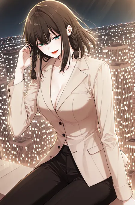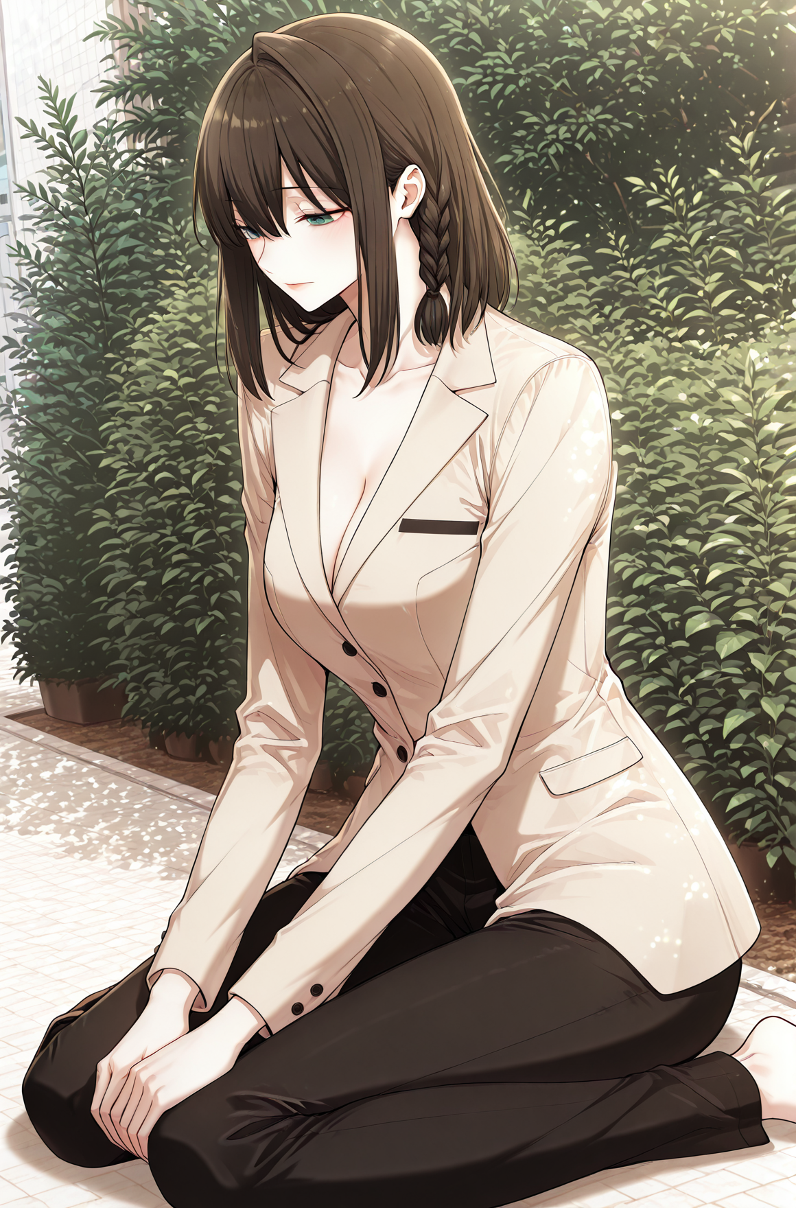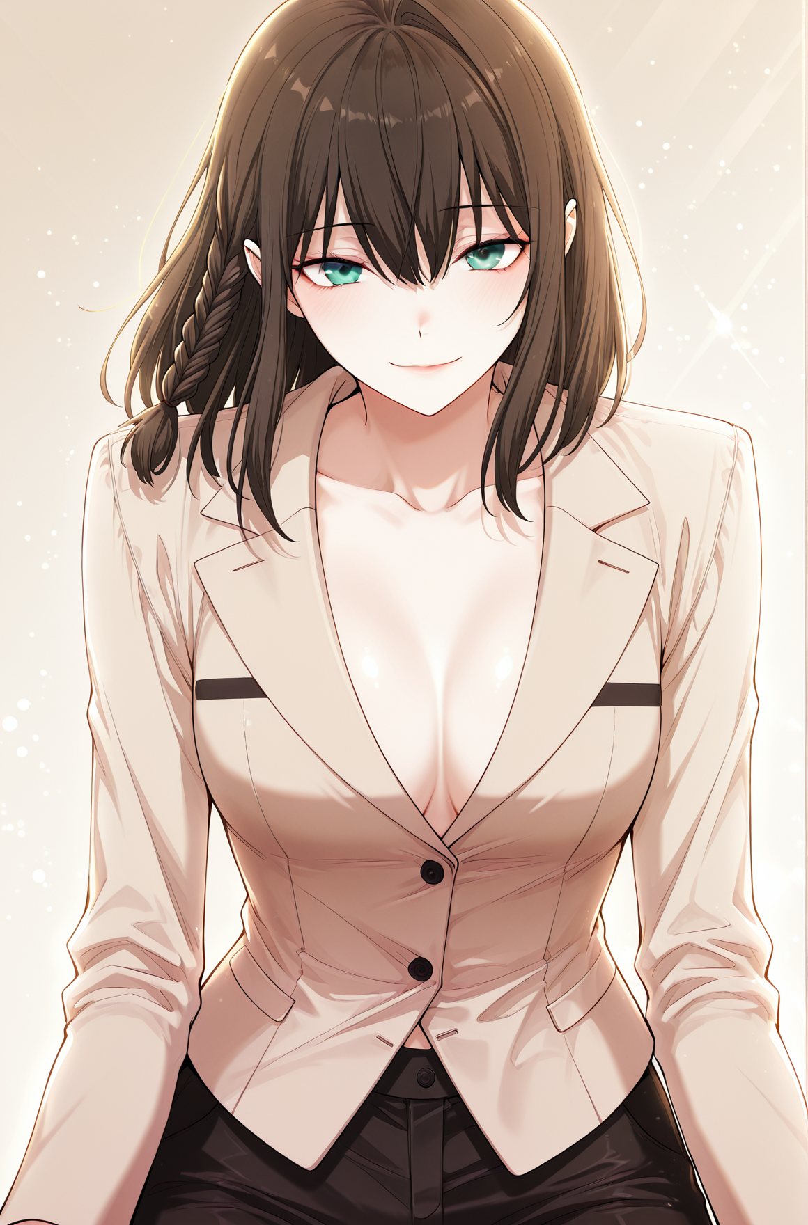 Yoonariv3_outfit2, beige blazer, black trim, cleavage, long sleeves, notched lapel, buttoned blazer, black buttons, black pants,