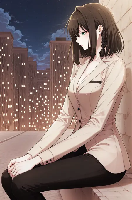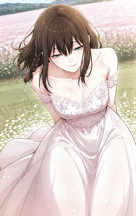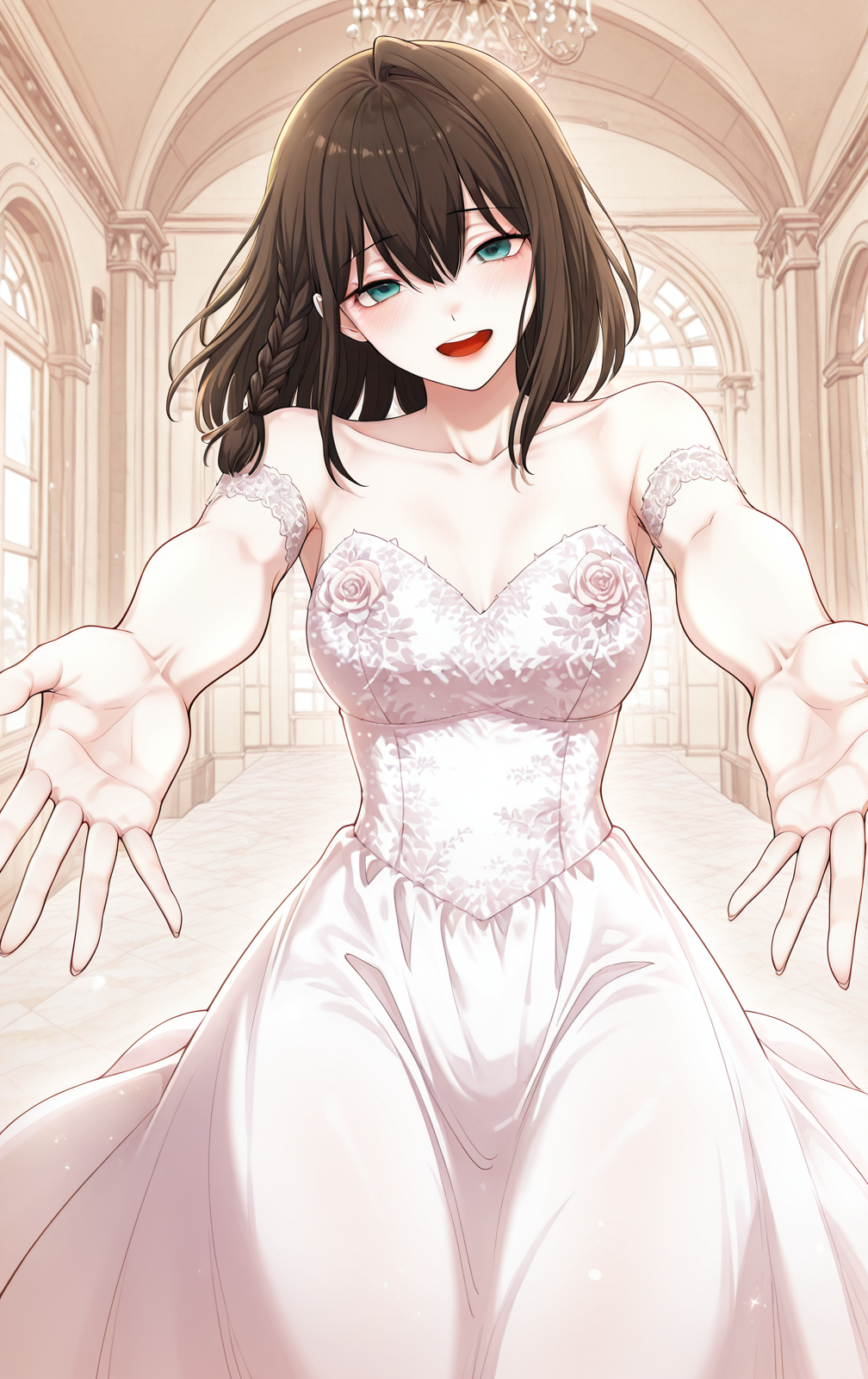 Yoonariv3, 1girl, solo, mature female, teal eyes, dark brown hair, medium hair, straight hair, front bangs, hair between eyes, long sidelocks, loose hair, side braid,
