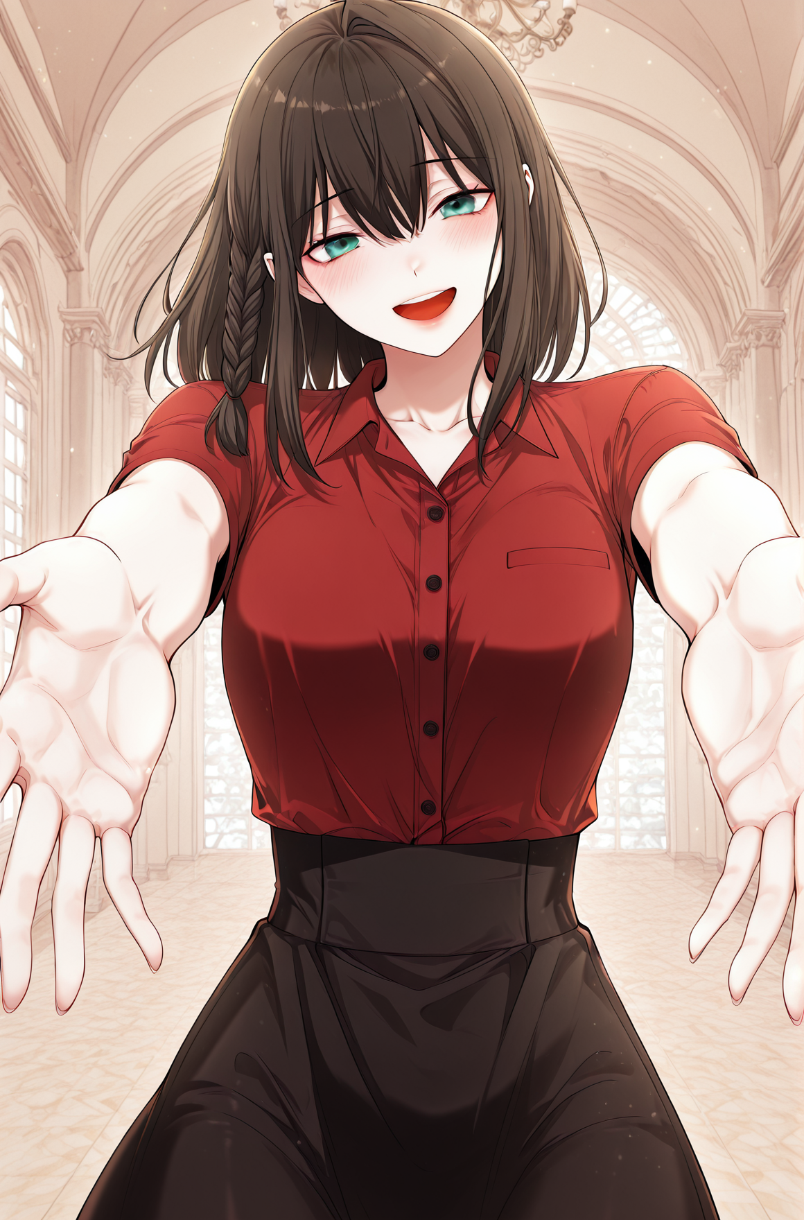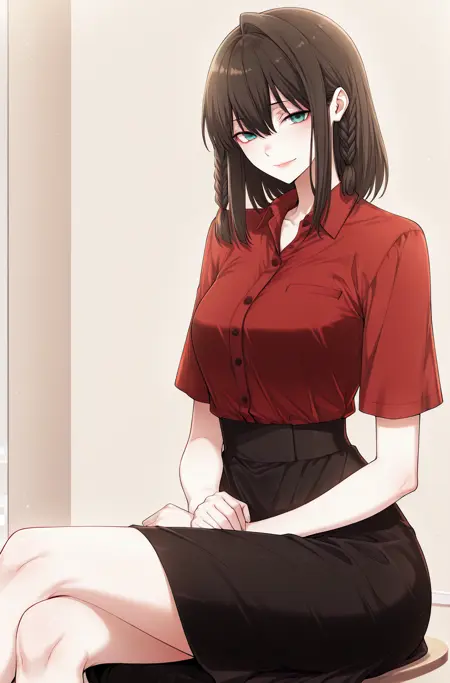 Yoonariv3_outfit1, red shirt, short sleeves, collared shirt, buttoned shirt, button up shirt, black skirt, high waist skirt
