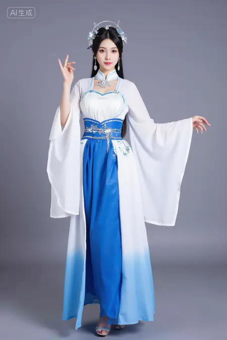 - 애니메이션 시리즈 "Renegade Immortal(仙逆)" 캐릭터: **Li Muwan(李慕婉)**의 복장. 트리거 단어: Li_Muwan_outfit white blue hanfu cosplay costume translucent chiffon fabric flared ruffled sleeves highwaisted layered skirt highlow hemline vibrant blue underlayer deep blue white ombre sash silver floral pattern silver ornate necklace intricate chest piece