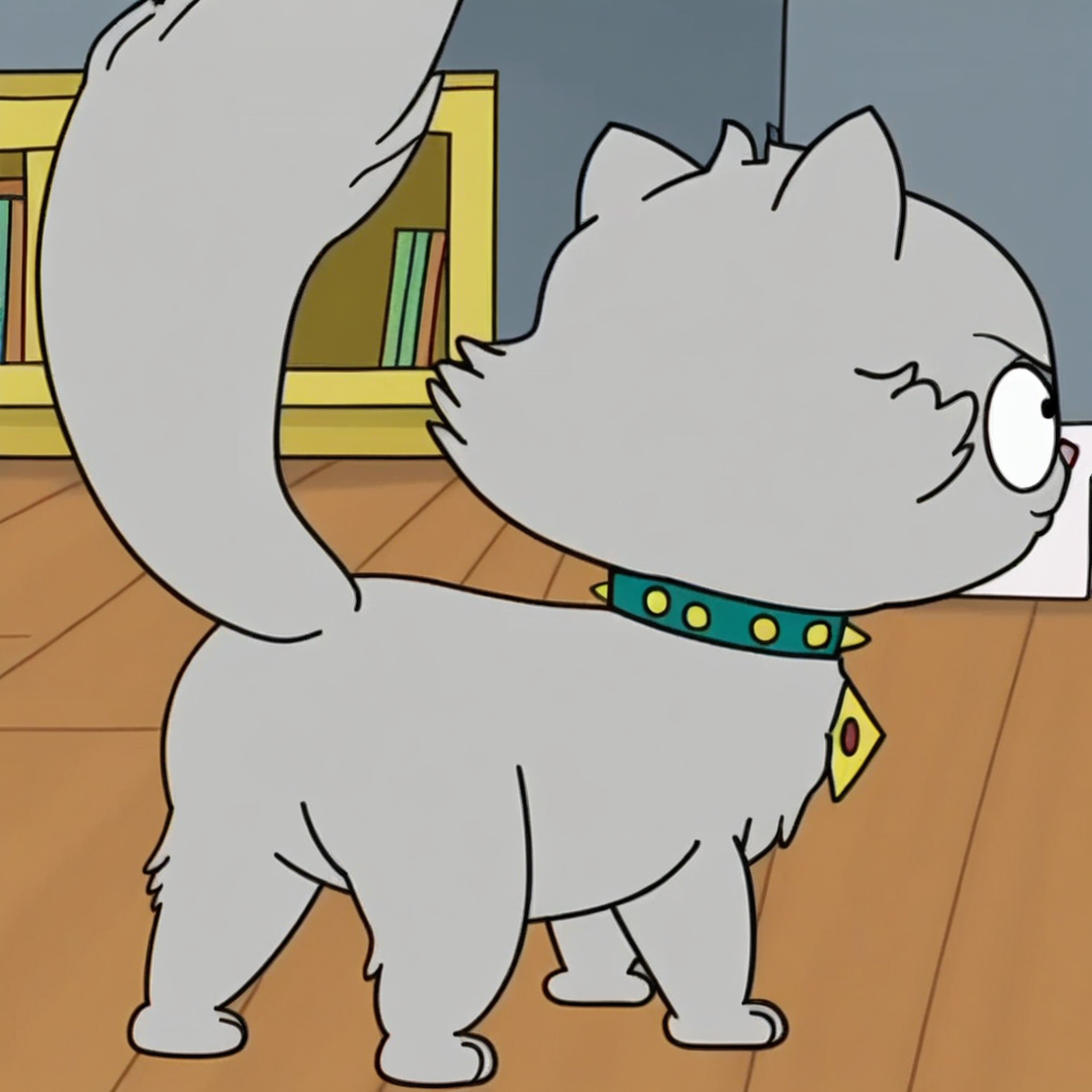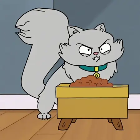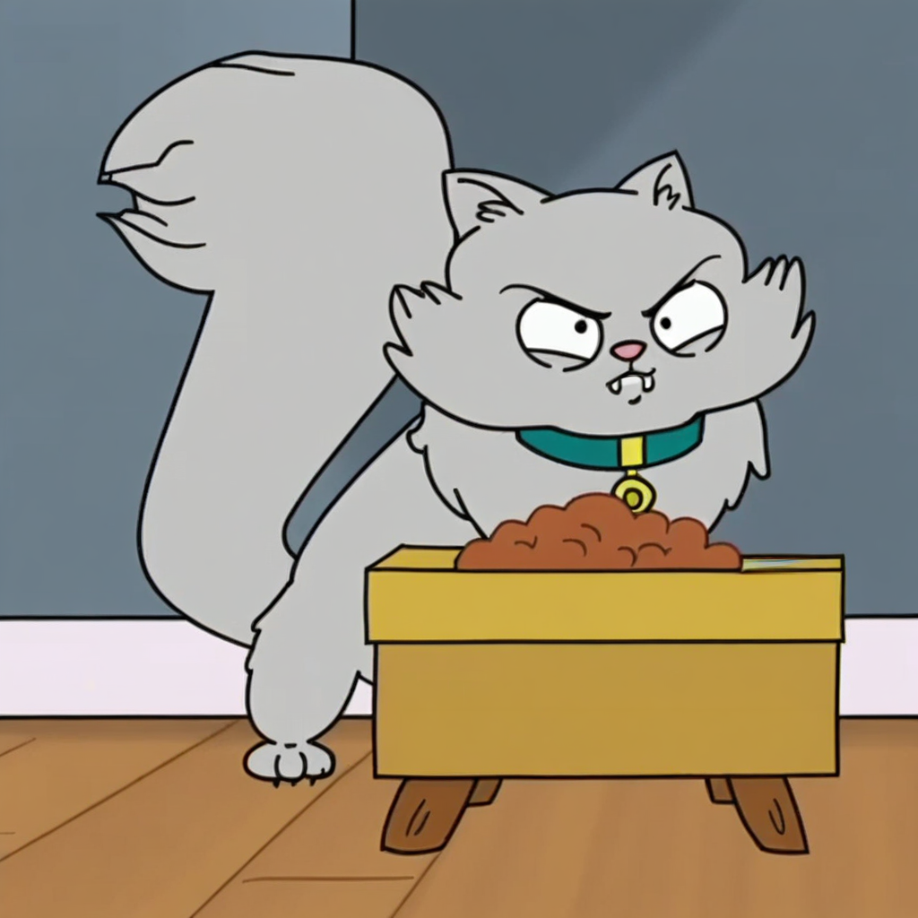 Prompt: kit kat season 1, feral, solo, cat, teal collar, pink magenta collar, black eyes, solo, yellow diamond shaped tag