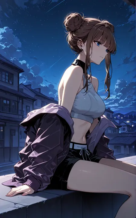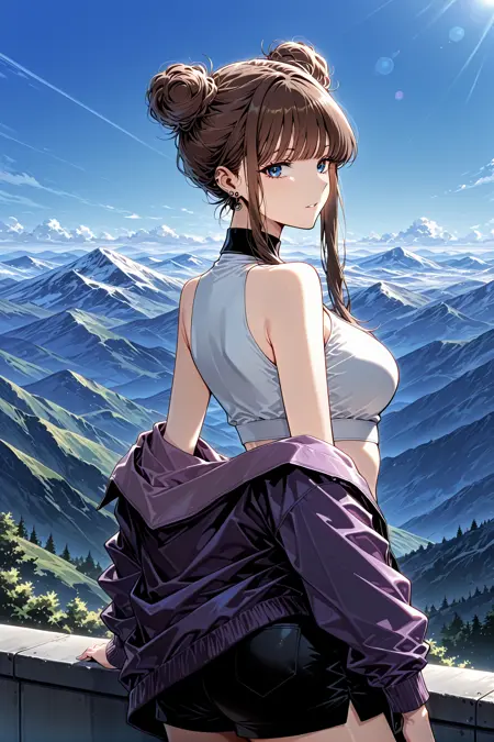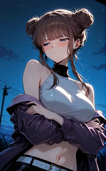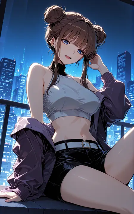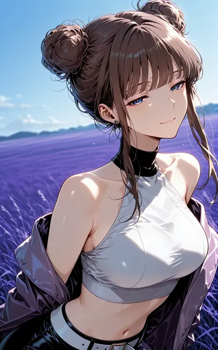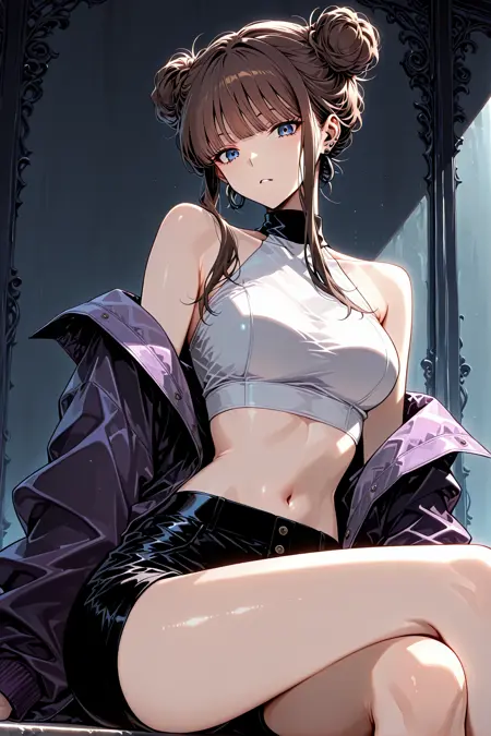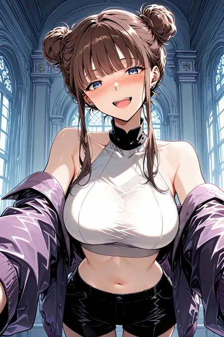 Calessa_服装,露肩夹克,裸露肩膀,敞开夹克,紫色夹克,长袖,宽松袖子,白色露脐上衣,无袖上衣,高领,黑色领子,露腹,黑色短裤,白色腰带,