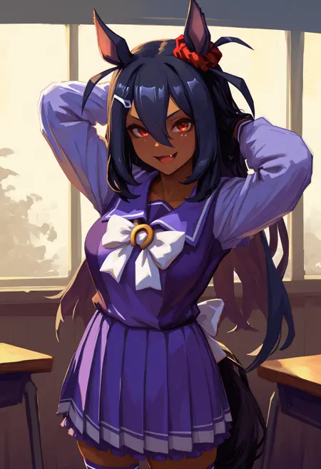 デフォルトの衣装: hshdef, dark-skinned female, horse tail, black hair, hair between eyes, hairclip, animal ears, ear ornament, red scrunchie, red eyes, two-tone shirt, blue shirt, white shirt, crop top, white sleeves, single detached sleeve, arm ribbon, blue ribbon, two-tone skirt, white skirt, blue skirt, pleated skirt, miniskirt, brown belt, thigh strap, leg ribbon, white choker, collarbone, midriff, navel, cleavage