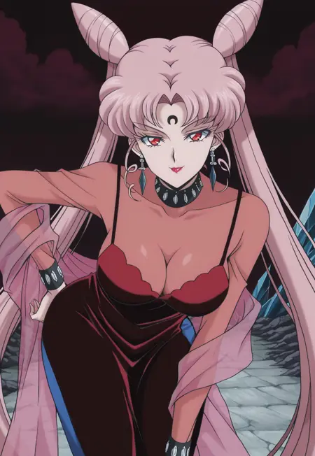 blackladyxl1111, black lady, pink hair, double bun, cone hair bun, twintails, very long hair, crystal earrings, red eyes, crescent facial mark, lipstick,