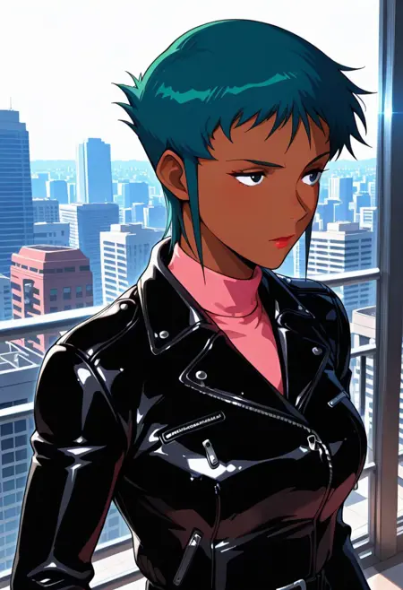 Paloma, 1 female, dark skin, black eyes, green hair, short hairstyle