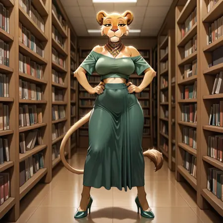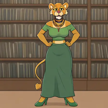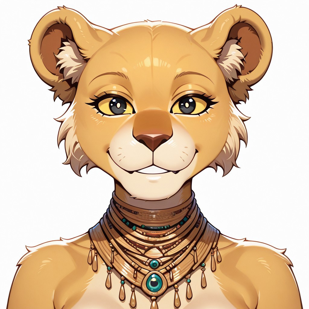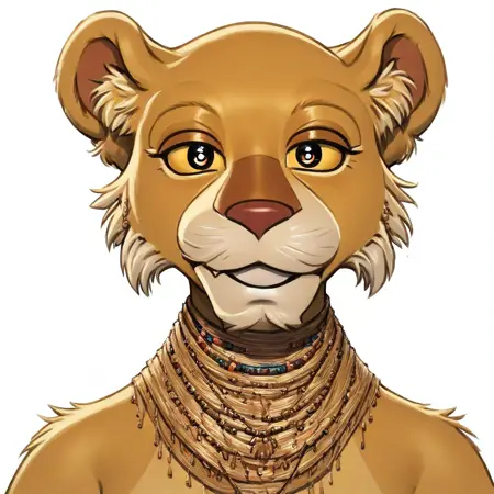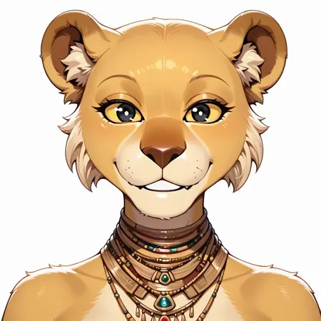 lion, lioness, yellow and tan fur, black pupils, yellow sclera, lion ears, brown nose, necklace,