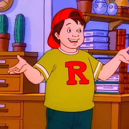 Prompts: male, chubby, brown hair, baseball cap, backwards hat, black eyes, green t-shirt, print shirt, pants, sneakers