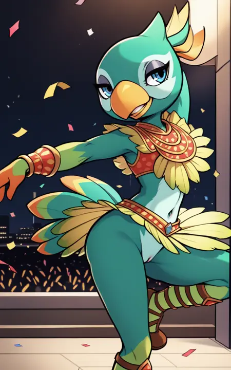 強化タグ: 尾、鳥の尾、羽、くちばし、青い目、毛むくじゃら、鳥、緑の肌、多色の肌