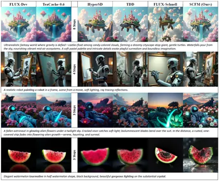 이 모델은 FLUX 시리즈 체크포인트에 LoRA로 가중치를 적용하여 3~8단계 내에서 이미지를 생성할 수 있도록 해줍니다.