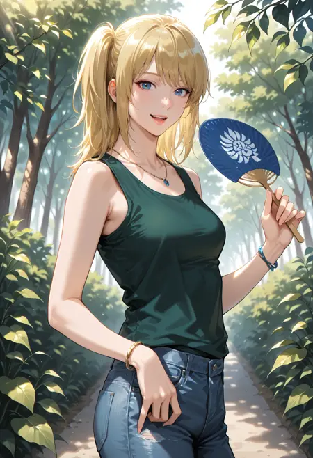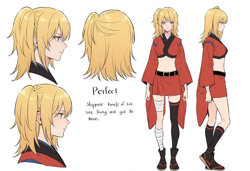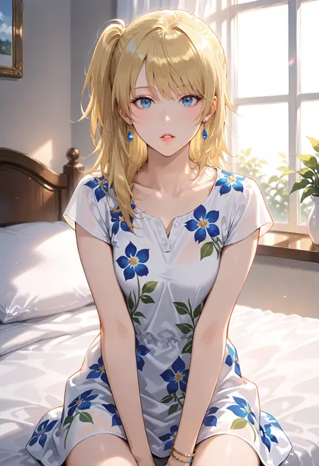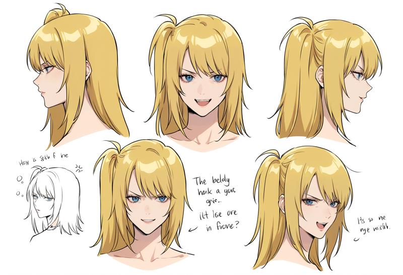 외모: 1명의 소녀, 파란 눈, 금발, 긴 머리, 짧은 머리, 한쪽만 들린 머리, 사이드 플레이테일