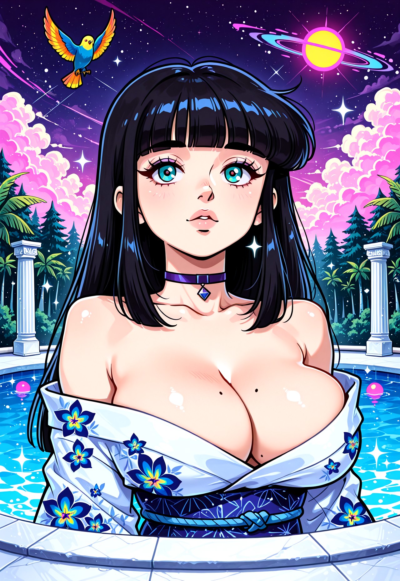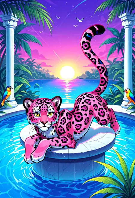 공간, 무지개, 대리석, 기둥, 우물, 타일, 야자수, 일몰, 구름, 반짝임, 여름, 정글, 그라데이션 색상, 새, 앵무새, 천국의 새, 베이퍼웨이브, 플로럴 패턴, 재규어, 판다, 그런 것들.