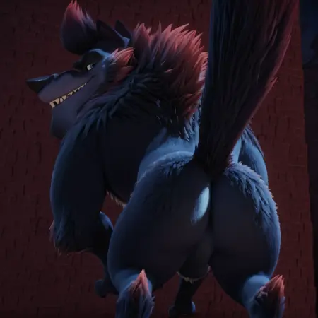 Flasheart, solo, furry male, mature, black nose, long tail, werewolf, dark blue fur, red highlights, pointy ears, blue eyes, furry, fangs, teeth