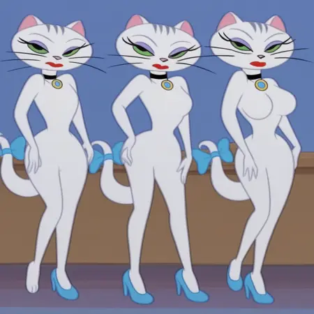 GalCatTomandJerryBCB, White Cat Girl, feminine, green eyes, purple makeup, Red Lipstick, three grey stripes on her head, white skin, cat tail, light blue ribbon on her tail, choker,