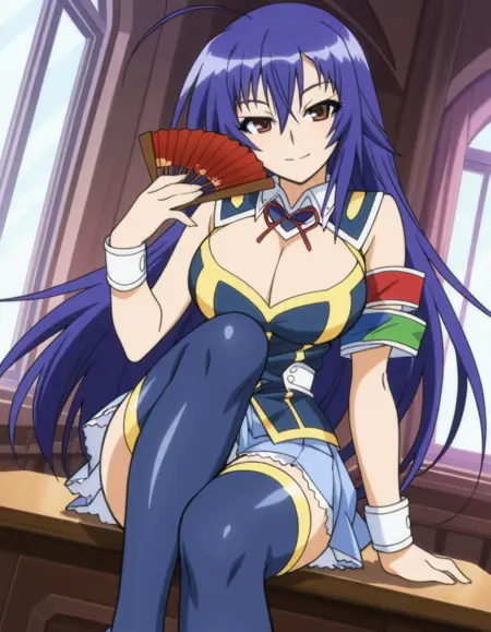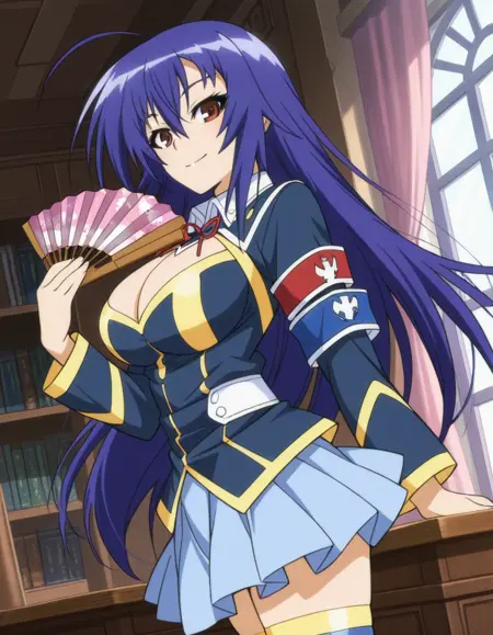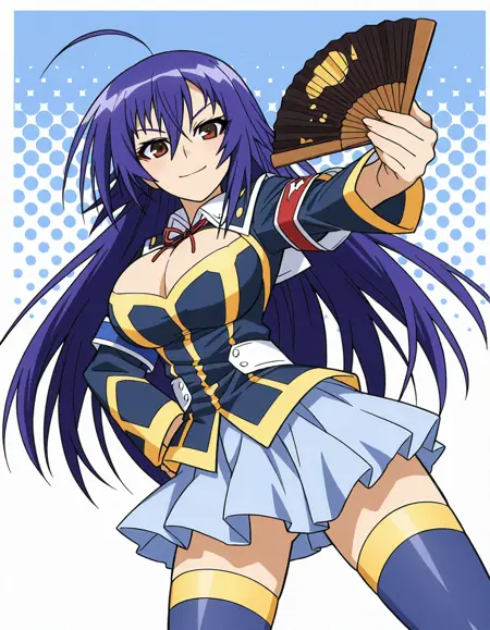 她的标志性造型包括飘逸的深蓝色长发、锐利的 crimson 红眸,以及带有彩色袖章的独特学生会制服,这些袖章象征着她的权威与多才多艺。Medaka的气场散发着优雅、自律与力量——完美融合了优雅与主导力。