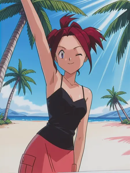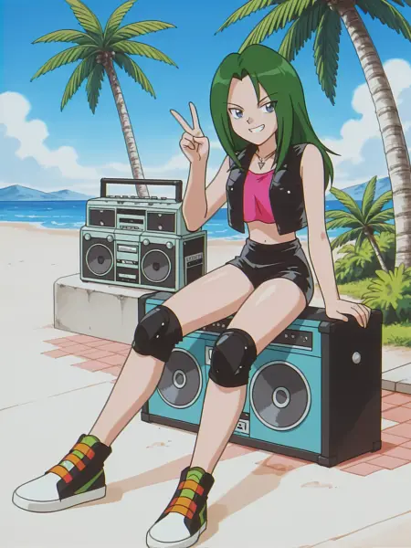 m1s4pok3m0n, (绿色头发:0.6), (蓝色眼睛:0.6), 项链, 背心, 黑色背心, 短上衣, 粉色衬衫, 短裤, 护膝