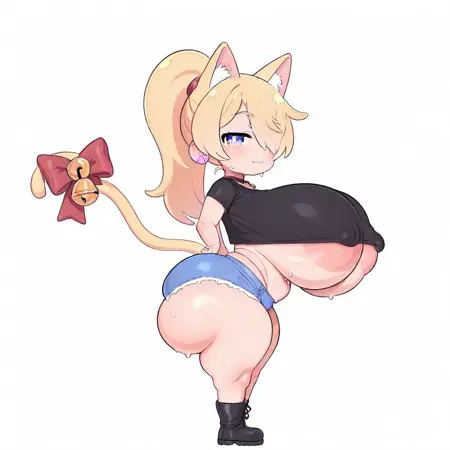 OC: 아테나, 아테나(고양이소녀), 네코 소녀, 고양이 귀, 금발, 긴 꼬리머리, 파란 눈, 하트 모양 귀걸이, 꼬리에 달린 빨간 리본과 종, 고양이 꼬리, 빨간 글씨 "NEK♥"가 적힌 검은 티셔츠, 단정한 파란 반바지, 두꺼운 허벅지, 곡선이 아름다운 체형, 검은 부츠