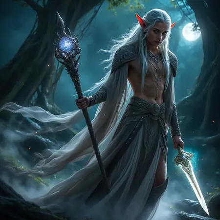 “fantasylora, 은색 머리카락이 은색에서 깊은 청남색으로 변하는 젊은 여성, 피부는 광택 난 강바위처럼, 액체로 된 별빛이 빛나는 강가에 서 있다. 그녀는 한 줄기 달빛으로만 조각된 지팡이를 들고 있으며, 끝부분은 파란 빛으로 펄떡이고, 물 위에는 빛나는 다리들이 형성된다.”