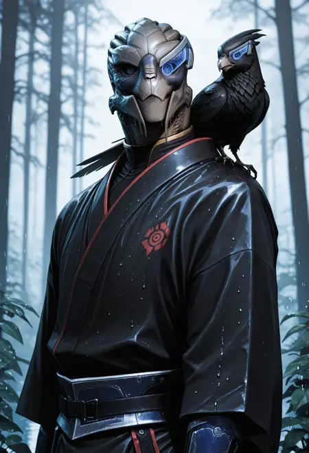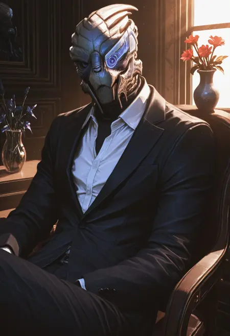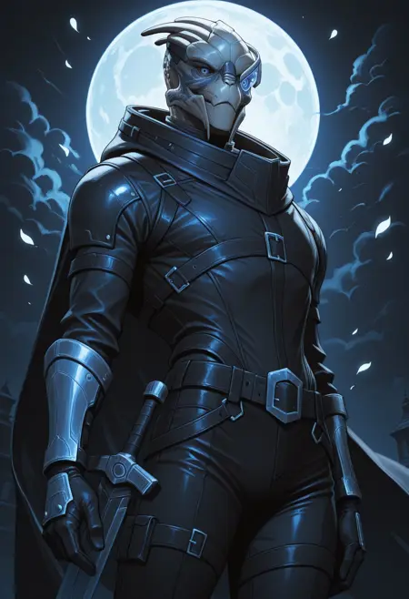 MEGarrus, Alien, 1boy, male focus, no humans, blue eyes, Grey Skin, armor, scouter