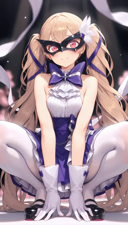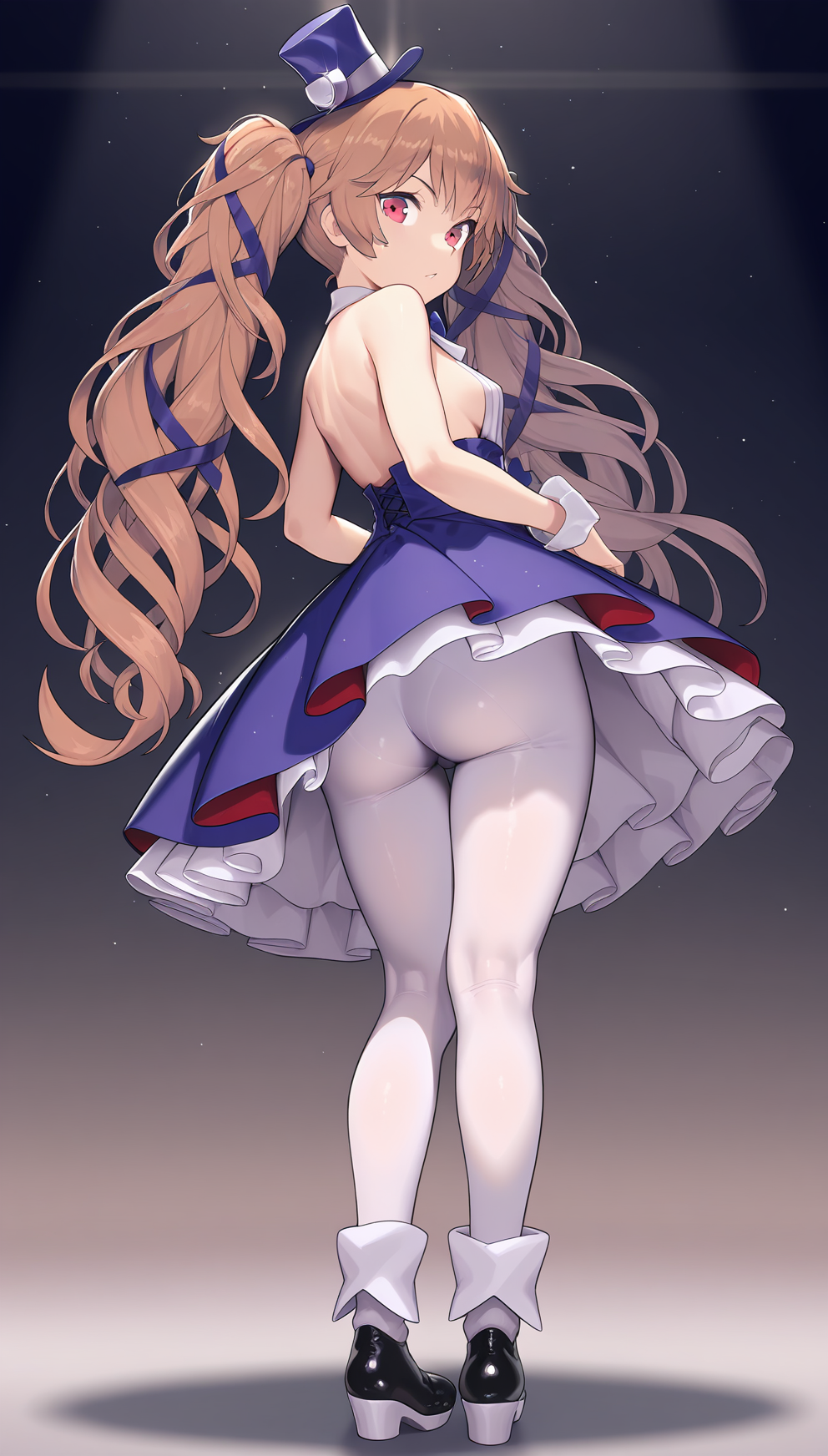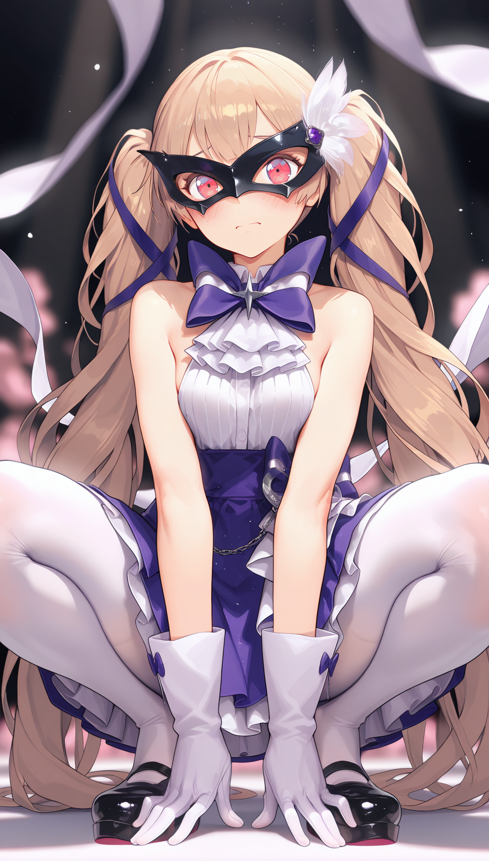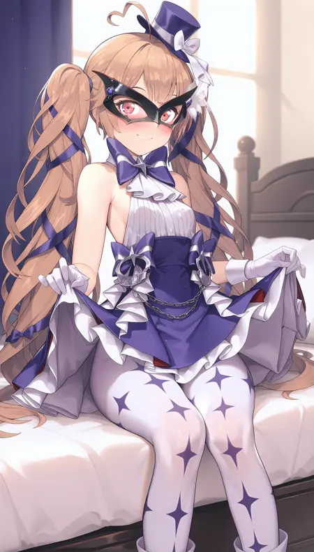 마스크, 장갑, 치마, 셔츠, 머리 장식, 드레스, 활, 리본, 어깨 노출, 머리 리본, 흰 셔츠, 아호게, 팬티스타킹, 손목 없음, 흰 장갑, 체인, 흰 팬티스타킹, 톱햇, 미니햇, 모자, 검은 신발,