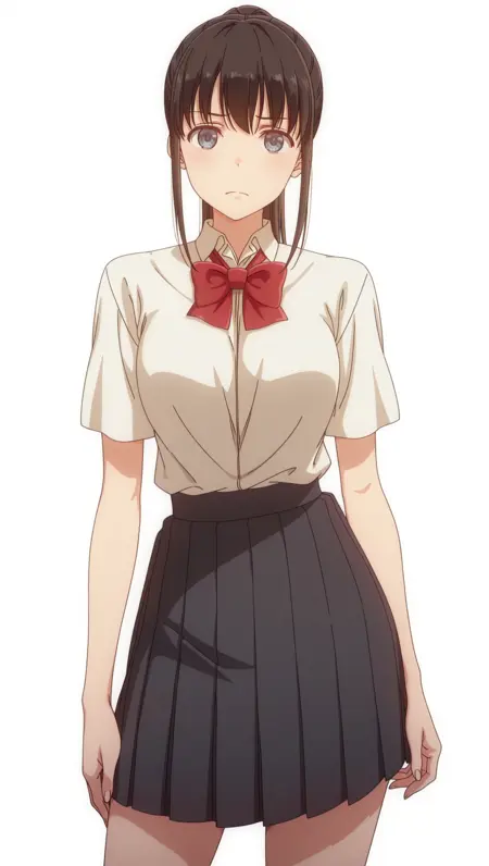 ((anime coloring)), masterpiece, best quality, amazing quality, airi, 1girl, long hair, ponytail, black hair, grey eyes, medium breasts, bowtie, shirt, white shirt, short sleeves, skirt, black skirt, pleated skirt, solo, pose, standing, looking at viewer, from front, ((((white background, simple background))))