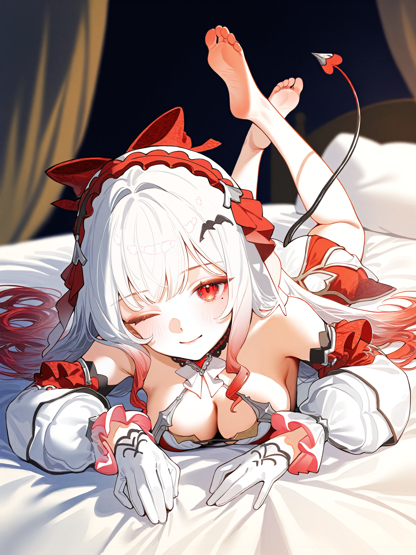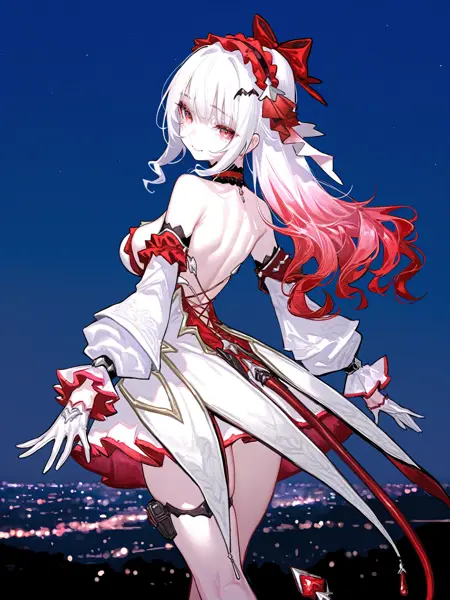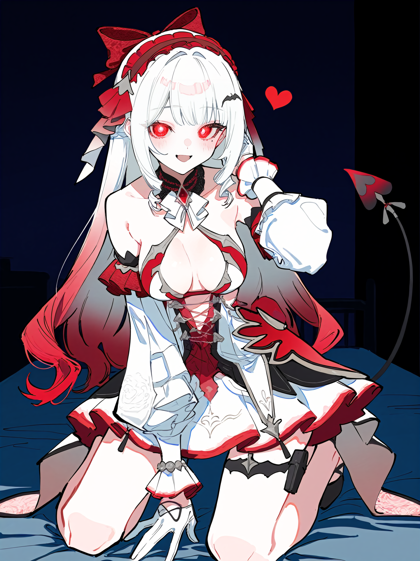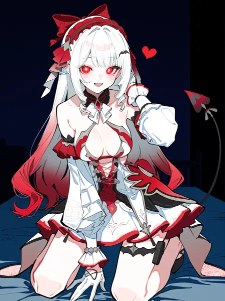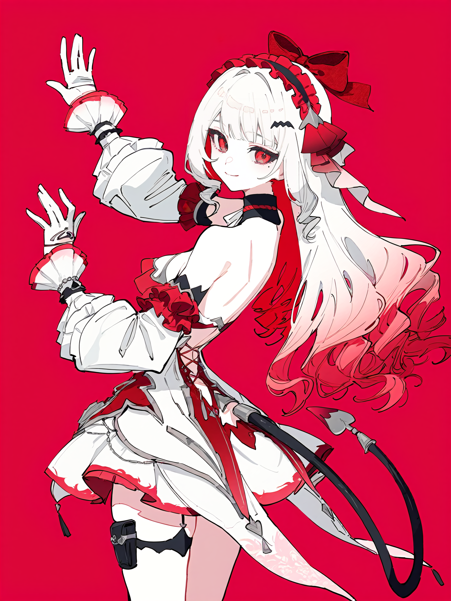 Clarina, Clarina-Crimson_Moon, red eyes, red hair, white hair, multicolored hair, white gloves, mole under eye, tail, white sleeves, red_hair_bow