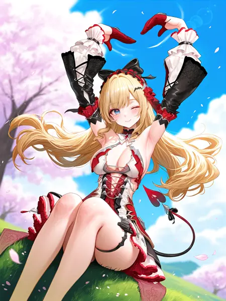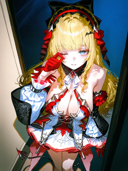 Clarina, Clarina-Crimson_Moon, blue eyes, blonde hair, red gloves, mole under eye, tail, black sleeves, black_hair_bow