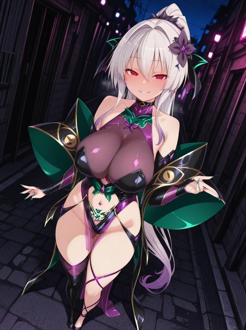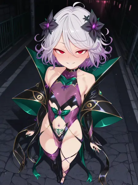 Trigger word : earrings, elbow gloves, choker, clothing cutout, gradient hair, hair flower, slit pupils, highleg leotard, asymmetrical legwear, sharp fingernails, green pubic tattoo, navel piercing, thighlet, waist cape, pelvic curtain, bridal gauntlets, white hair, purple hair, see-through clothes, clothing cutout, red eyes, large breasts,