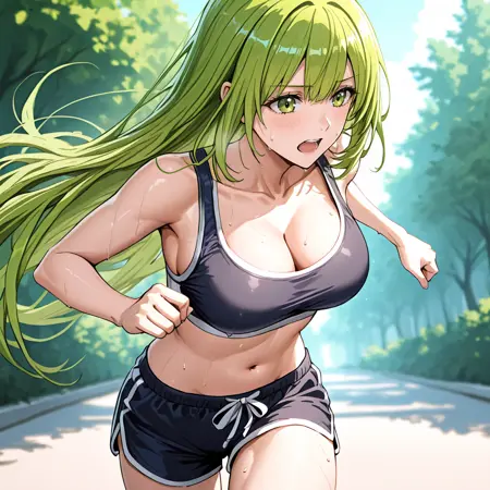 Trigger with girl form: EnkiduFate, enkidu (fate), green hair, solo,elbow gloves, green eyes, jewelry, earrings, midriff, 1girl, arabian clothes, black gloves, navel, crop top, pants, bare shoulders, cowboy shot