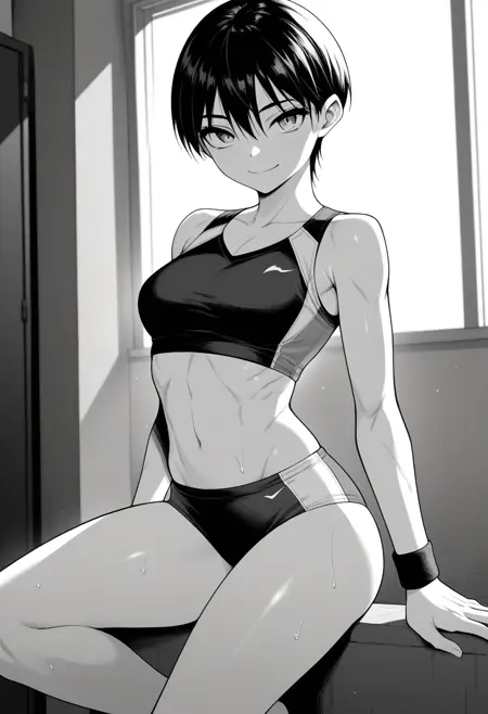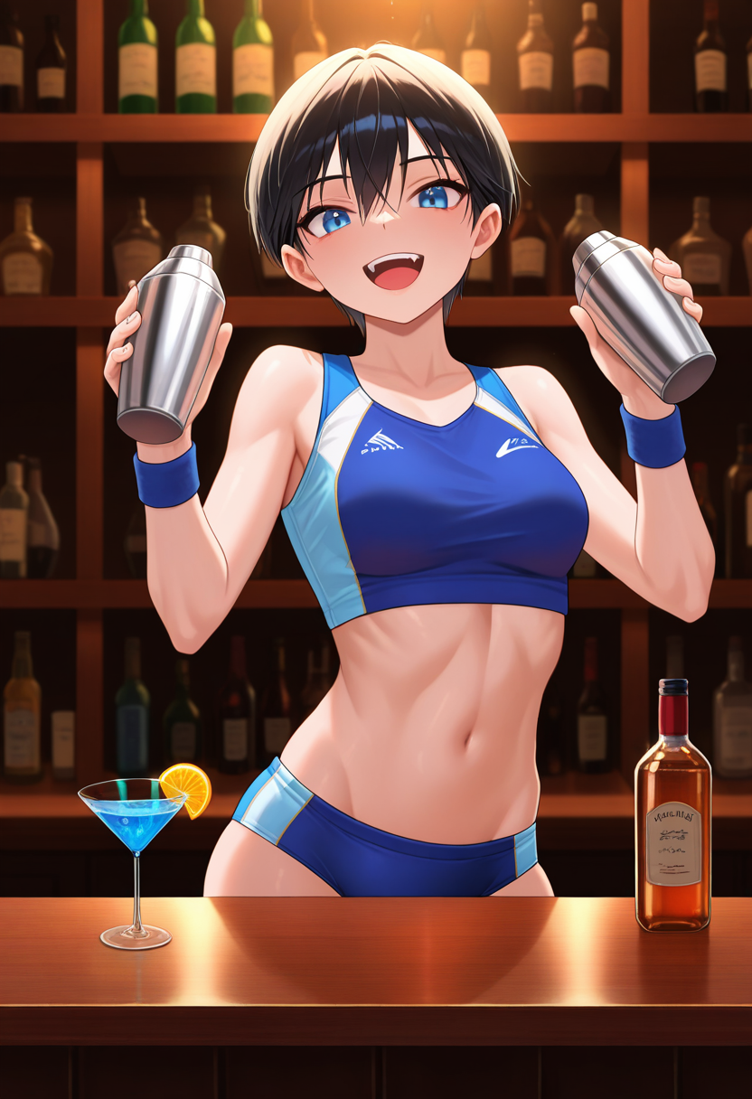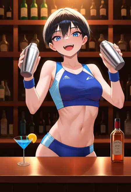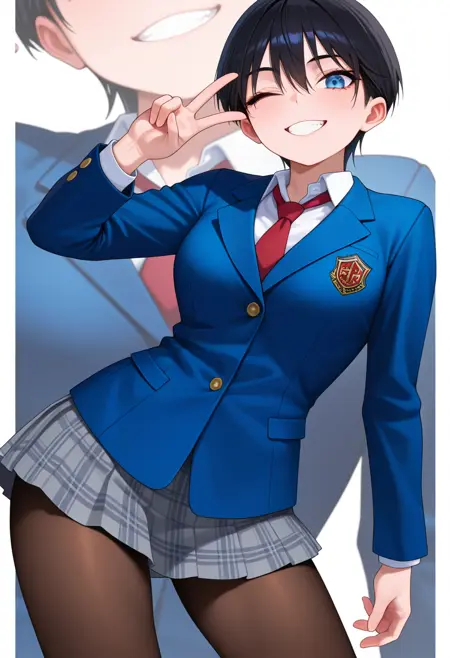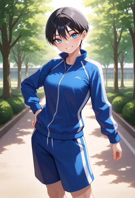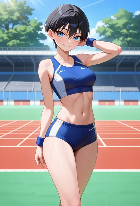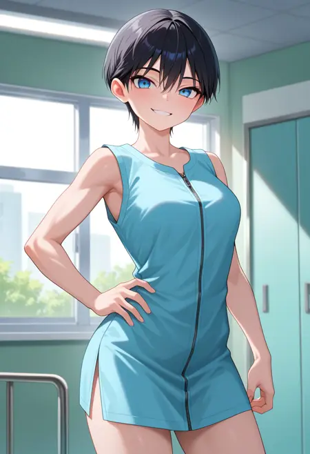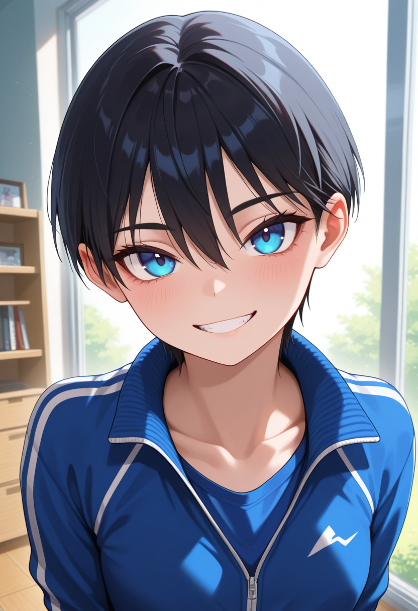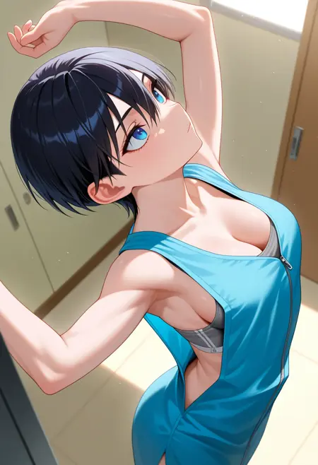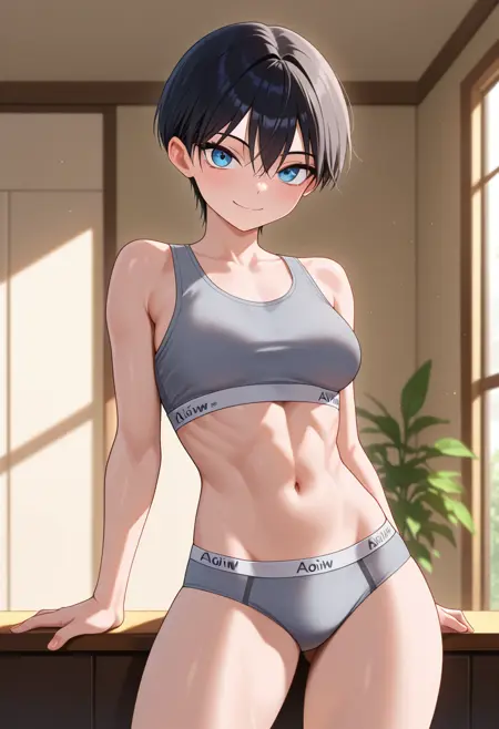 - aoiww, 男孩气, 中性, 健美, 蓝眼睛, 黑发, 短发, 发丝遮眼, 小胸,