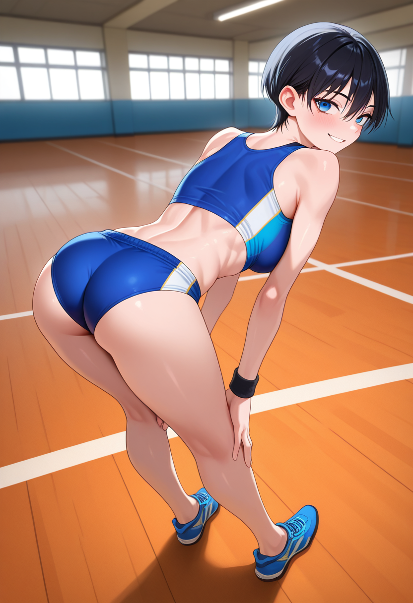 运动服套装, 双色运动胸衣, 蓝色运动胸衣, 护腕, 蓝色buruma, 无袜, 运动鞋,