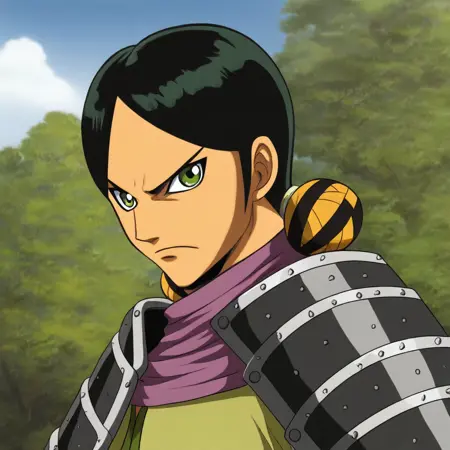 绿色眼睛,黑发,短发,发髻,双发髻,发饰,马尾,齐刘海,刘海,低双马尾,双马尾,围巾,肩甲,小披风,盔甲,腰带,