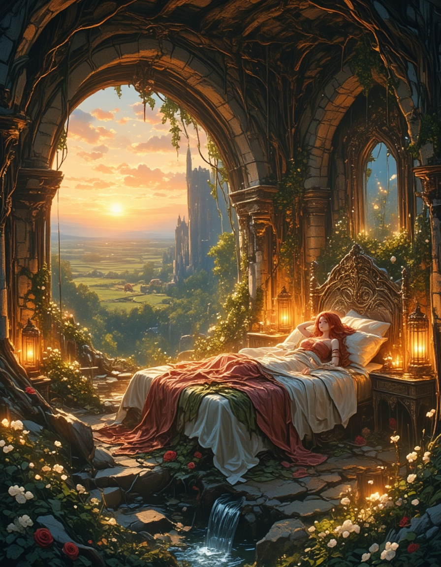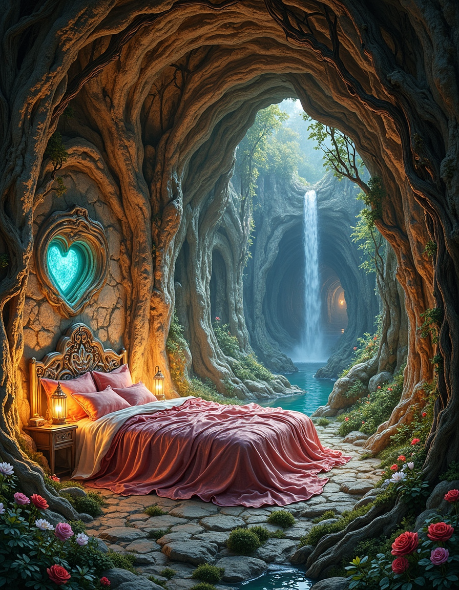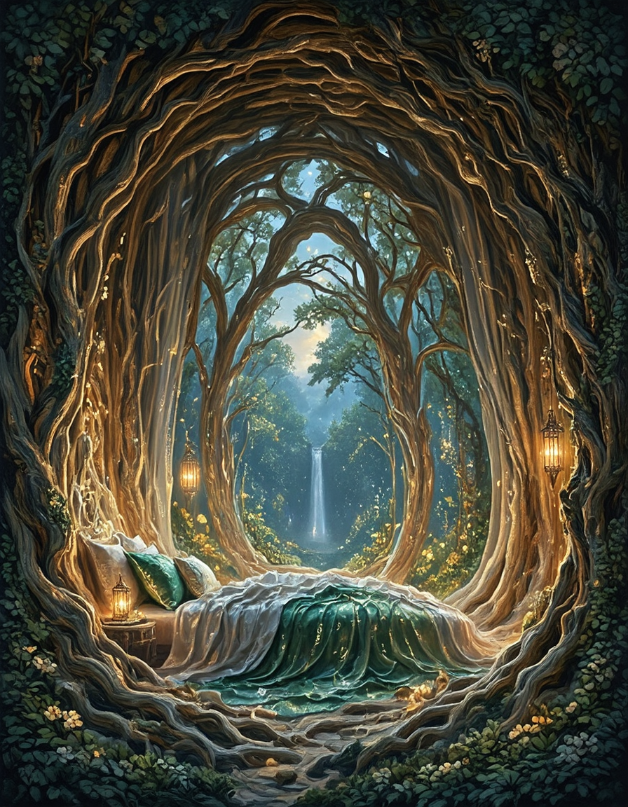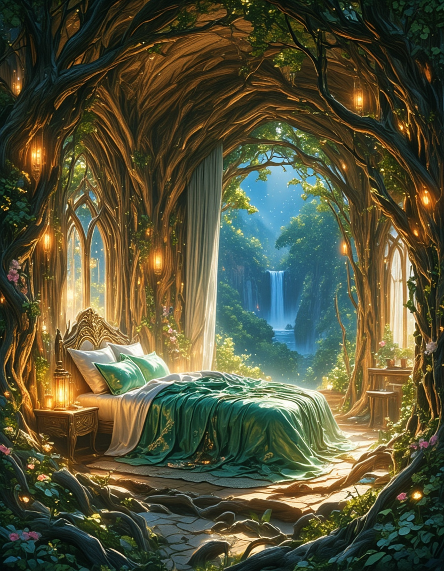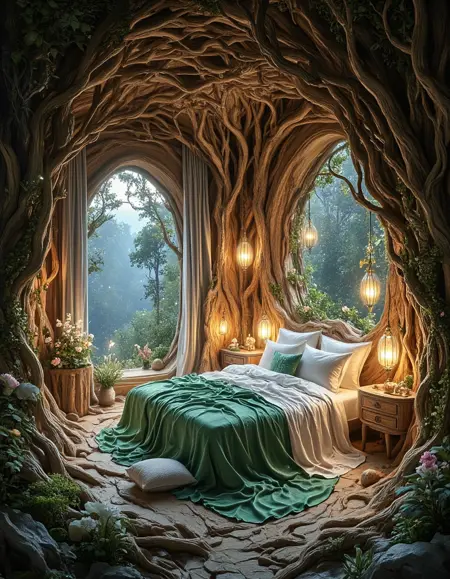 古代の木の中心にそっと彫り込まれたエルフ風のベッドルーム。滑らかな生きた木の壁は、生物発光の脈絡でほのかに輝き、高さのあるアーチ型の結晶ガラスの窓からは月明かりに照らされた森が広がっている。繊細な銀色のカーテンが柔らかな夜風にゆらめいている。ベッドはエメラルドとアイボリーのシルク製の流れるようなシーツに覆われ、ねじれた木の枝が自然な天蓋を形作り、光る花とツタで飾られている。家具は研ぎ澄まされた根や結晶から彫られた、優雅で有機的なデザインで、ほのかに魔法で輝くエルフのルーンで装飾されている。柔らかな黄金色の提灯が空中に浮かび、木の質感を優雅に照らす。窓から薄い霧が入り込み、夜の花の香りを運んでいる。外では、星々が木々の梢の間できらめき、遠くの滝は月明かりに輝いている。空気は静かで、神秘的で、永遠の時を思わせ、エルフの職人技と自然の深き調和が融合している。ハイディテール、シネマティック、魅惑的、ファンタジックなリアリズム。
