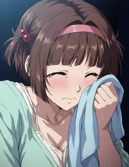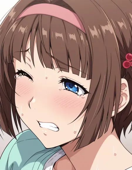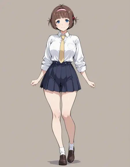 mai_kzs,mai_akihak,short_hair,brown_hair,blunt_bangs,blue_eyes,hair_ornament,pink_hairband,hair_bobbles,white_shirt,yellow_necktie,blue_pleated_skirt
