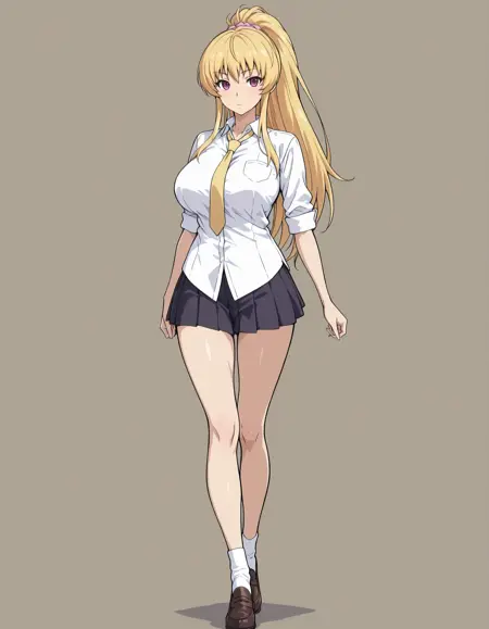 mai_kzs,mai_natsukik,long_hair,ponytail,blonde_hair,purple_eyes,white_shirt,yellow_necktie,pleated_skirt