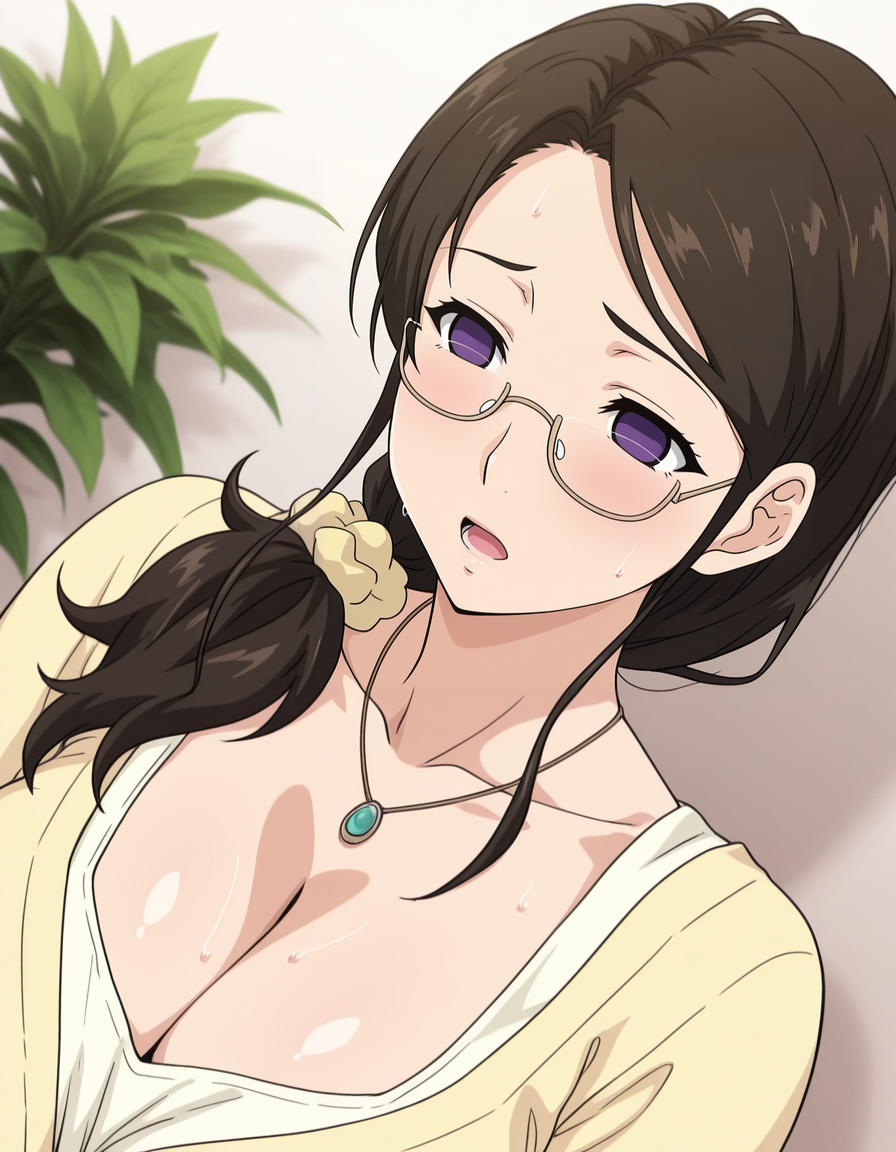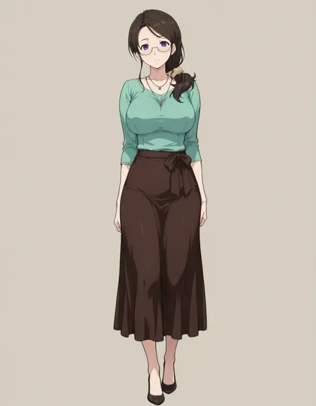 mai_kzs,mai_mifuyuk,long_hair,brown_hair,purple_eyes,large_breasts,ponytail,mature_female,hair_ornament,semi-rimless_eyewear,hair_scrunchie,necklace,brown_skirt,green_sweater,green_shirt