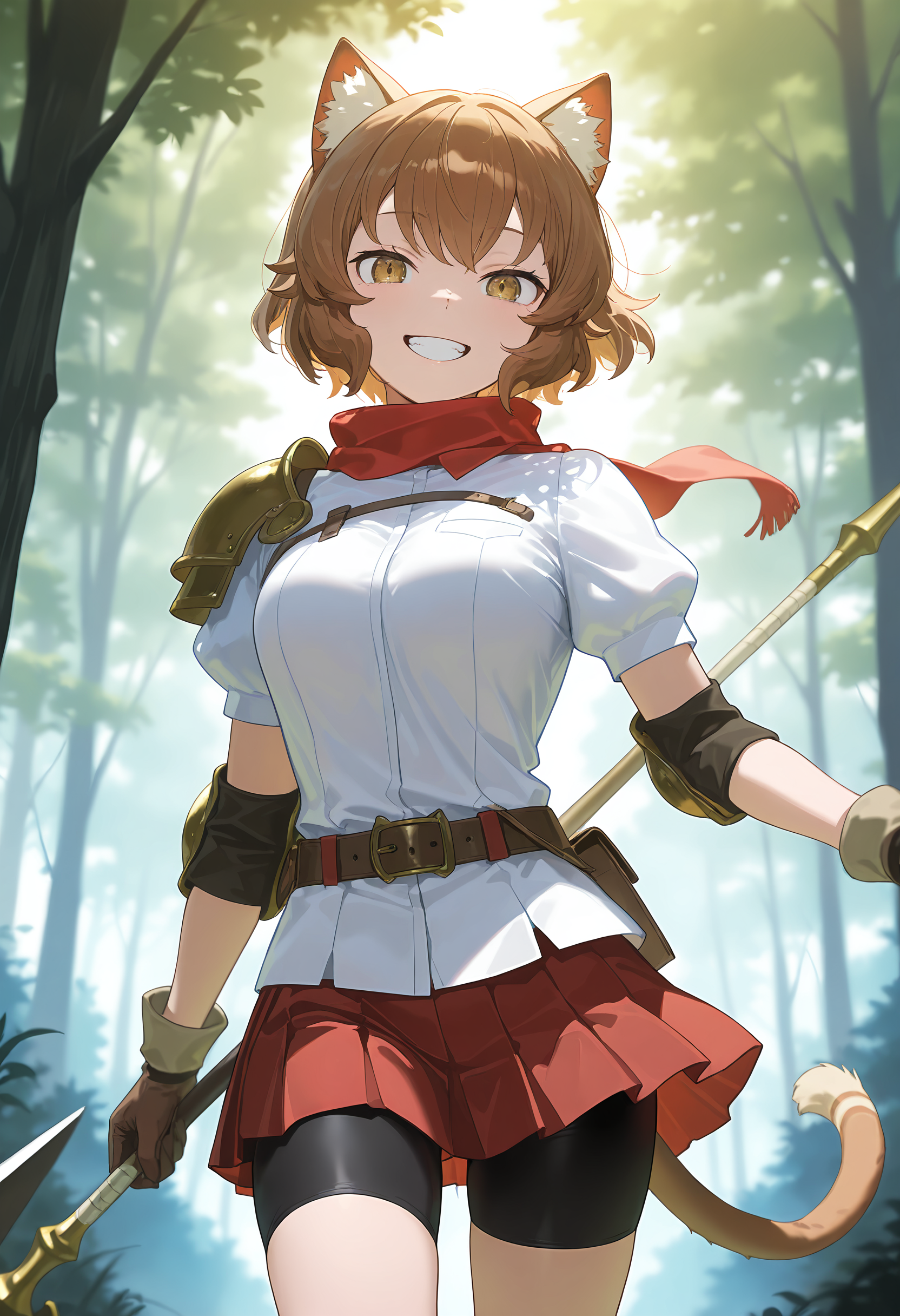Tags for her outfit N°2: white shirt, short sleeves, pleated skirt, belt, miniskirt, short shorts, black shorts, bike shorts, brown gloves, red skirt, red scarf, holding polearm, shorts under skirt, knee pads, shoulder armor, elbow pads,
