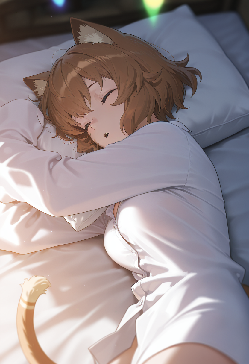 Tags for her look: 1girl, solo, medium breasts, short hair, brown hair, brown eyes, cat ears, cat tail, cat girl, animal ear fluff,