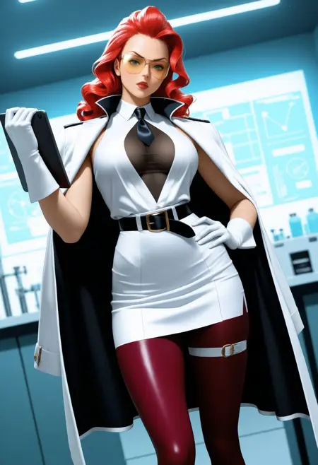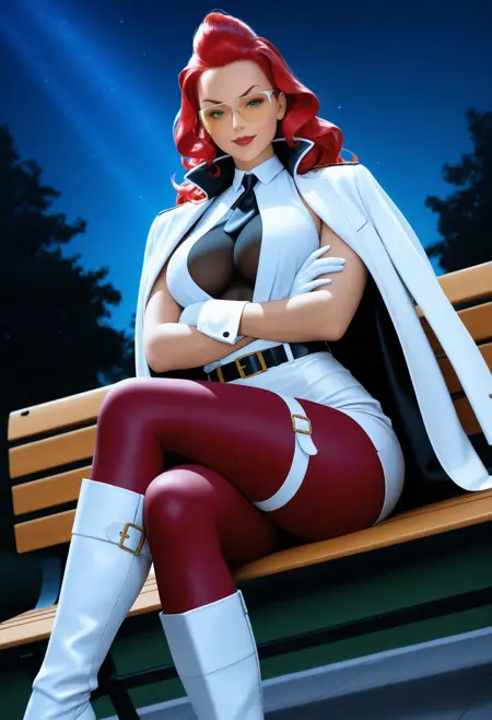 街头霸王6装扮:sf6_viper, long hair, wavy hair, red hair, yellow-tinted eyewear, white shirt, sleeveless shirt, cleavage cutout, see-through cleavage, black necktie, white jacket, jacket on shoulders, white skirt, pencil skirt, white gloves, black belt, white thigh strap, burgundy pantyhose, white footwear, knee boots, high heel boots,