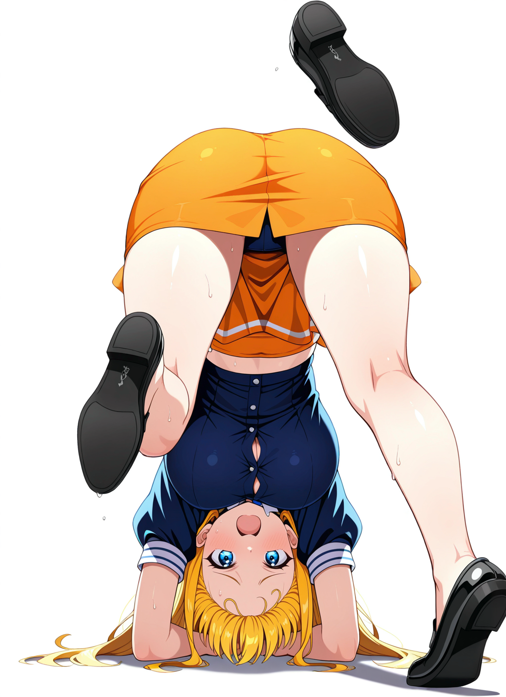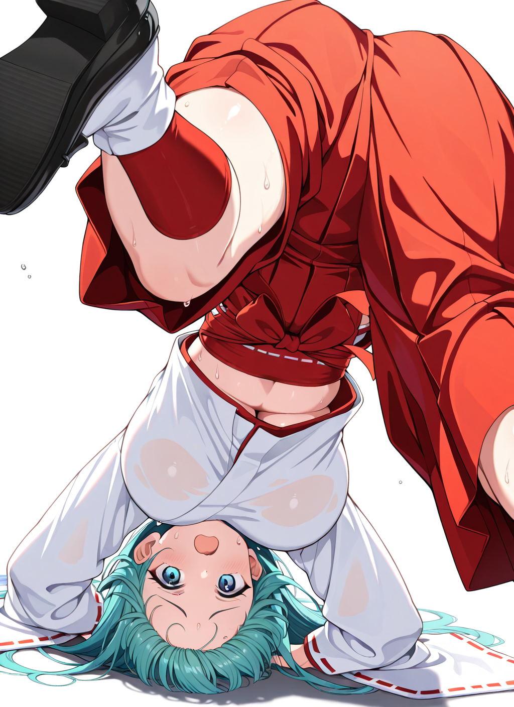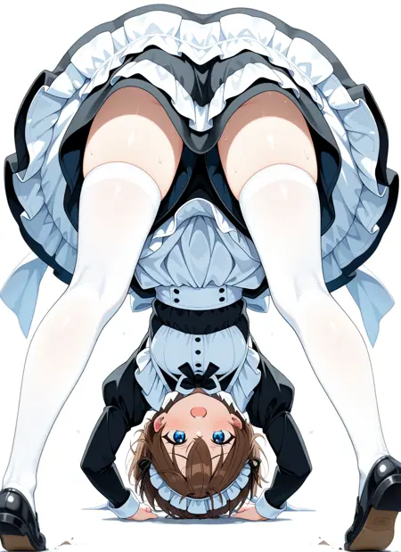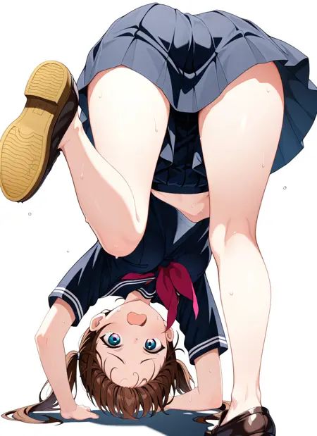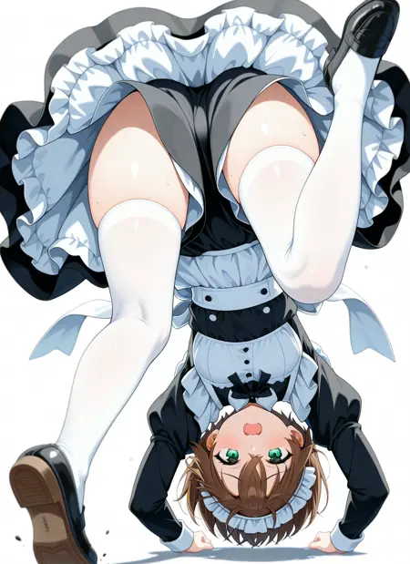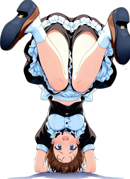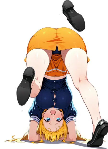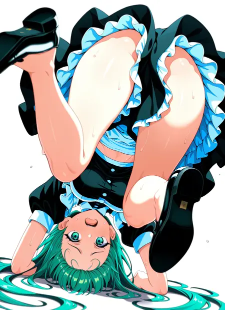 upside-down, midriff peek, shoe soles, fallen down