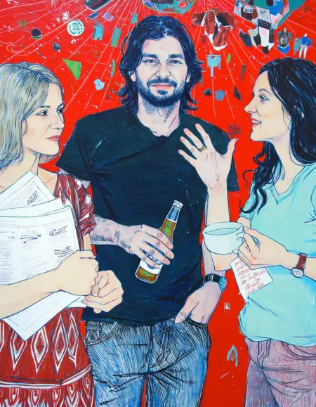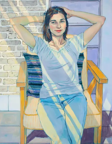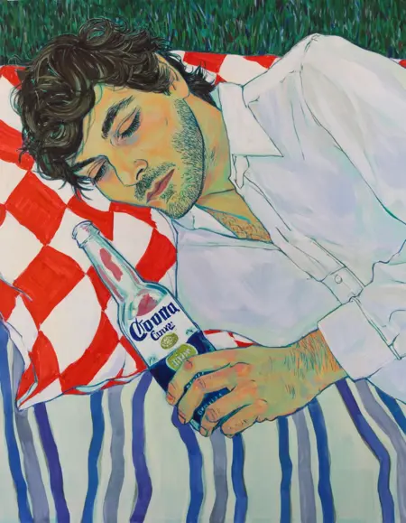 明るい自然光の下、鮮やかな緑の芝生に横たわる酔っ払いの男性の絵。彼の濃い波状の髪は大きな多肉植物に部分的に隠れ、チェックの赤黒シャツと薄い短パンを着用し、片方の腕には水ボトルを持ち、もう片方の腕はリラックスして置かれている。彼は鮮やかな植物の横に縞模様の枕に横たわり、表情は穏やかだ。背景には明るい青い水体が広がり、温かい濃い緑と対照的なクールなトーンを加えている。hope-gangloffのスタイルで