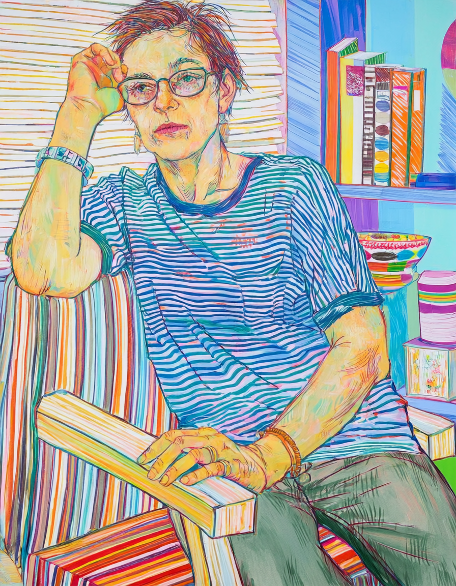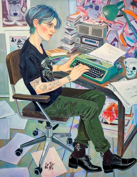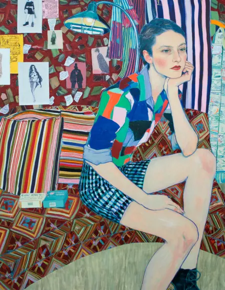 パターン入りのソファに静かに座る女性の絵。短い黒髪は鮮やかな幾何学模様のシャツとチェック柄の短パンとよく似合っており、天井のランプから柔らかく照らされた pale な肌には控えめな影が落ちている。右腕は膝の上に、左手はあごを支え、遠くを見つめている。周りにはメモやファッションスケッチが飾られた壁があり、縞模様と花柄のさまざまな生地に囲まれ、彼女の横には「たばこのパック」が置かれている。hope-gangloffのスタイルで