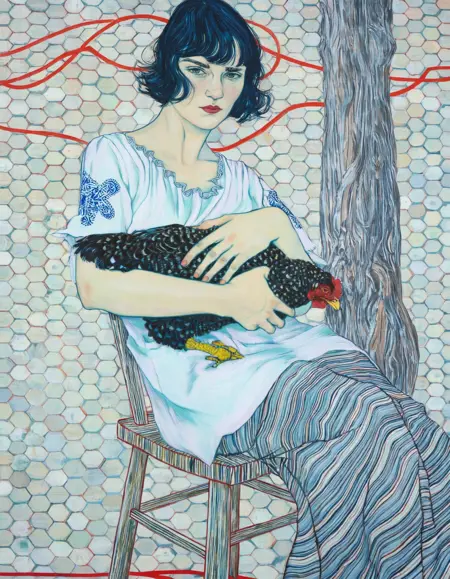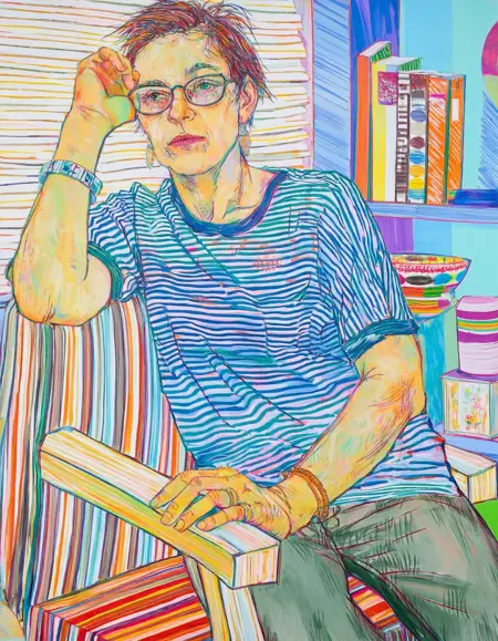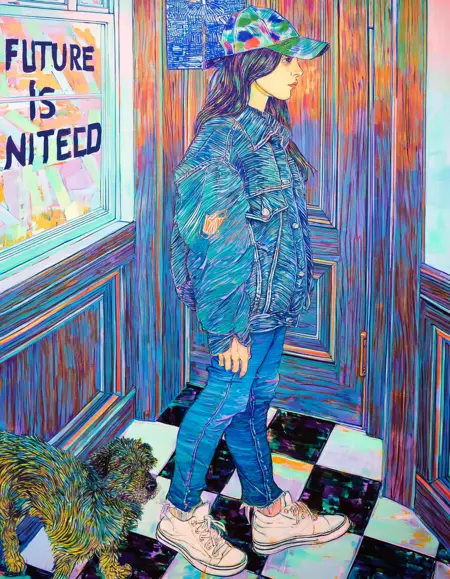 長い濃いテアルートの髪を肩に流す女性の絵。矩形のメガネは周囲の光をわずかに反射し、彼女の表情は真剣で思慮深い。上を見上げており、質感のあるノースリーブトップを着用し、画像に繊細な模様を加えている。背景には、いくつかの明るい白い光の爆発から放射状にエネルギーに満ちた線が広がり、動的な動きの感覚を生み出し、女性の姿を強調している。照明はクールなトーンと彼女の温かみのある肌とのコントラストを強調し、作品に現代的でデジタルのような審美性を与えている。細部にわたる複雑な線画が全体に施されている。hope-gangloffのスタイルで