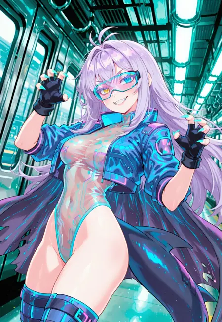 cysruner,青いハーネッククロップトップ,青いマイクロショーツ,ヘキサゴンプリント,ヒップベンチ,チョーカー,紫のクロップドジャケット,クロスレースジャケット,片方の肩出し,肘までグローブ,パンティストラップ,へそ,ミッドリフ,ユーティリティベルト,紫の太ももブーツ,