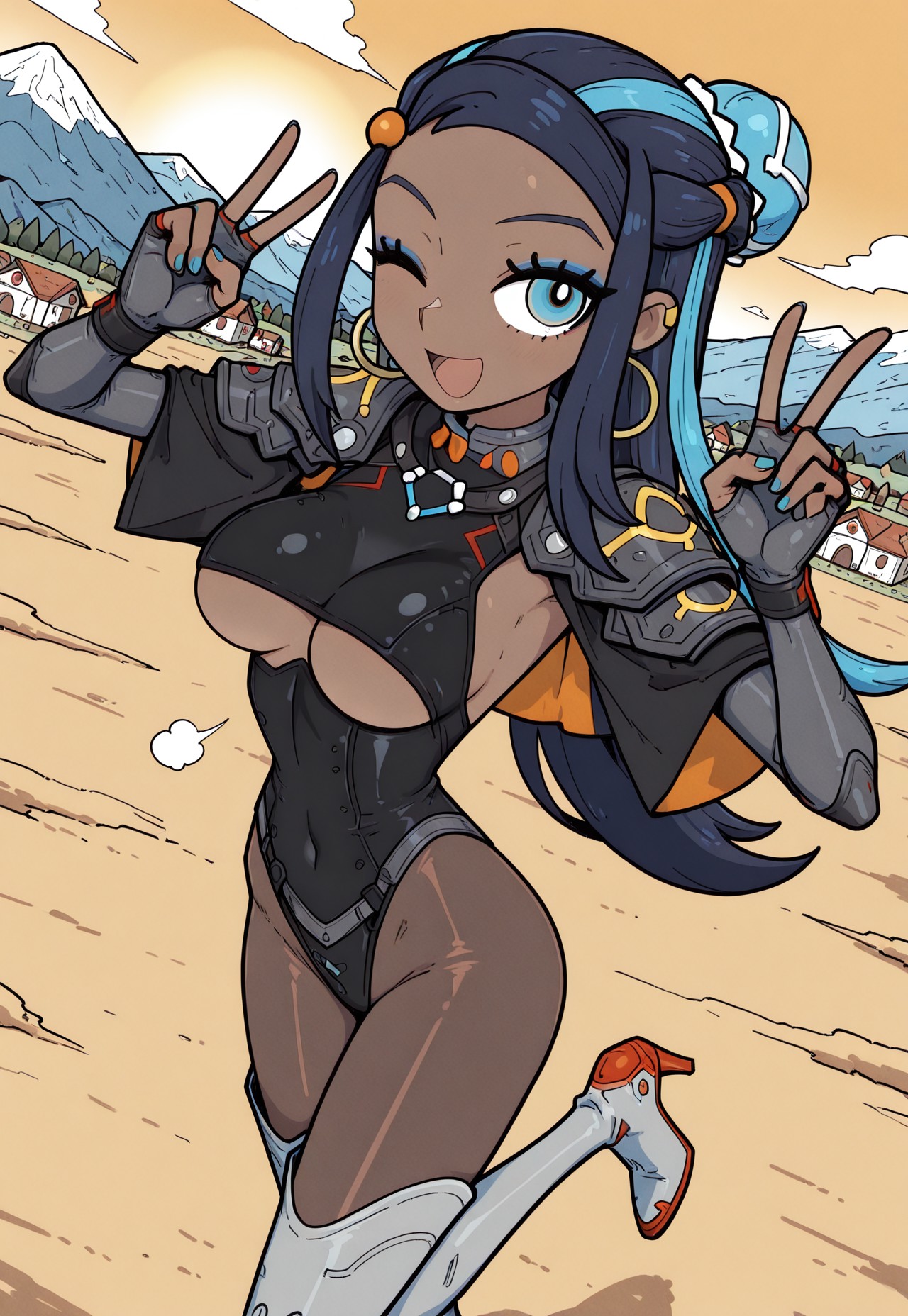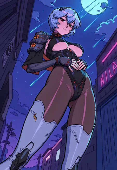 cysruner,blue halterneck crop top,blue micro shorts,hexagon print,hip vent,choker,purple cropped jacket,cross-laced jacket,single bare shoulder,elbow gloves,panty straps,navel,midriff,utility belt,purple thigh boots,