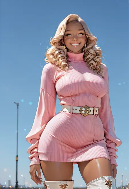 This was an OC created with Illustrij BTTR (credit where credit is due to reijlita). Generally, I created this LoRA to make a standard buxom blonde without having to type the description over and over. I did decide to have a default outfit, a pink sweater dress and white thigh-high boots, so there's some training in that regard.
