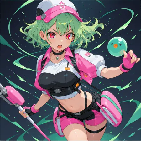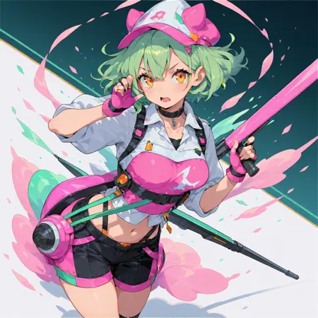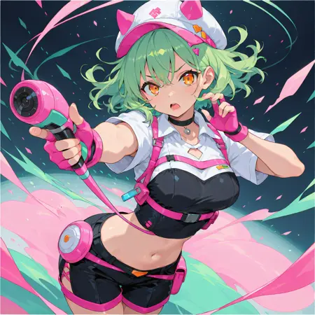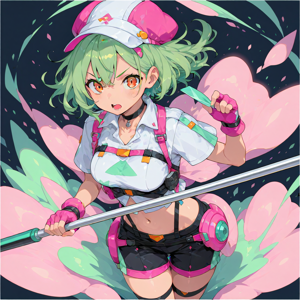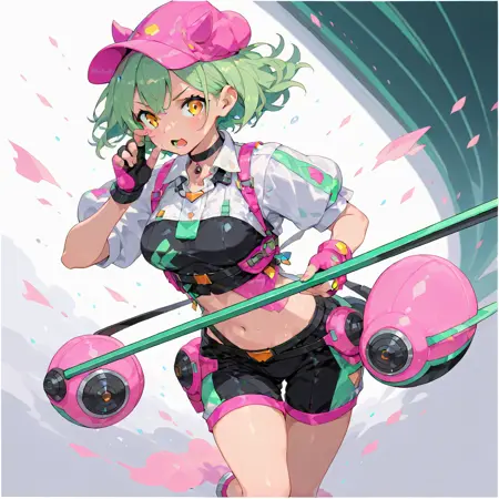 gloves, fingerless gloves, green hair, open mouth, navel, looking at viewer, hat, choker, black choker, breasts, shirt, pink gloves, orange eyes, medium breasts, shorts, holding,