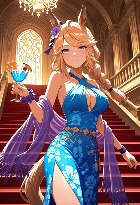 G0ldGntl, blue eyes, blonde hair, long hair, braided ponytail, hair flower, horse ears, horse tail, print dress, blue dress, criss-cross halter, cleavage, wrist scrunchie, wristband, see-through shawl, purple shawl
