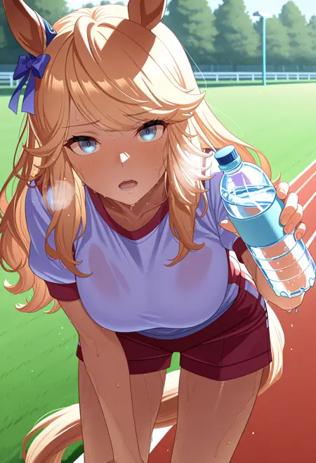 G0ldC1ty, blue eyes, blonde hair, long hair, horse ears, blue ear ribbon, horse tail