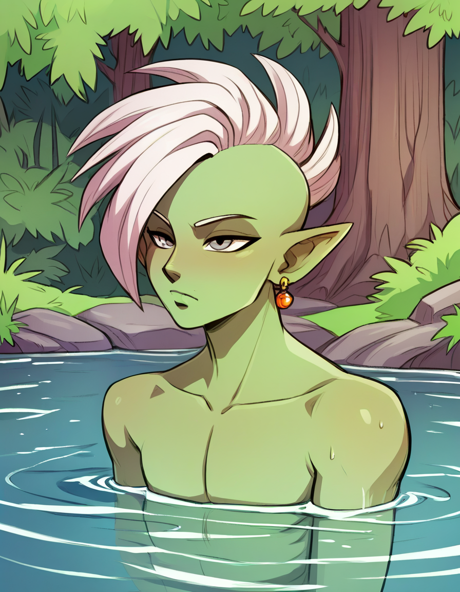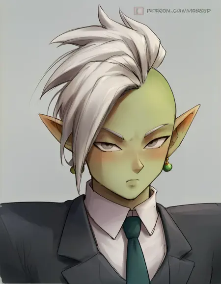 Additional tags: colored skin, green skin, mohawk, white hair, grey eyes, pointy ears, single earring, green earring, dougi, white boots