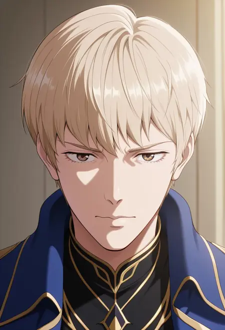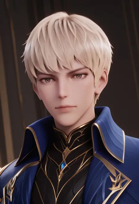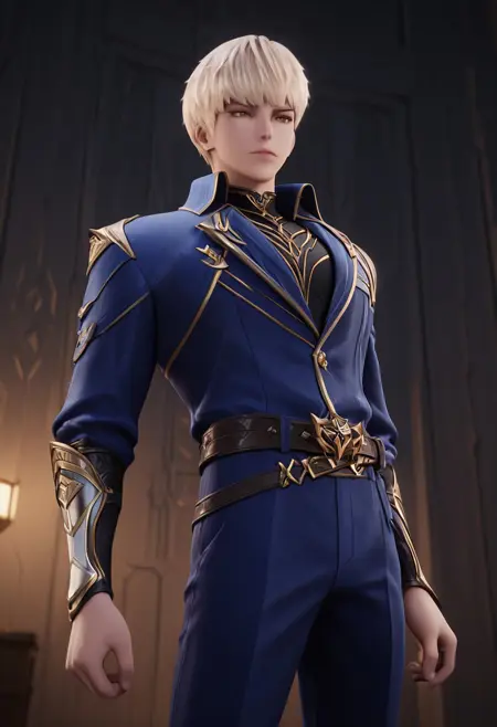 1boy, male focus, solo, brown eyes, blonde hair, black shirt, blue armor, high collar, shoulder armor, gauntlets, black pants, armored boots,